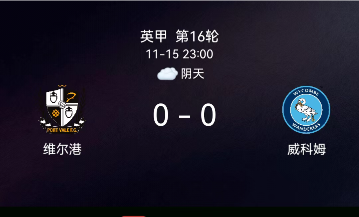 北京时间11月15日,英格兰足球甲级联赛第16轮,维尔港主场对阵威科姆。全场无进球,第68分钟威科姆球员染黄;无红牌记录。最终比分,维尔港0-0威科姆。
