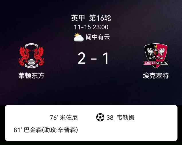 北京时间11月15日,英格兰足球甲级联赛第16轮,莱顿东方主场对阵埃克塞特城。第38分钟韦勒姆点射破门,1-0;第76分钟米祖尼破门,1-1;第81分钟巴肯森破门,2-1;埃克塞特城2张黄牌,莱顿东方无红黄牌。最终比分,莱顿东方2-1埃克塞特城。