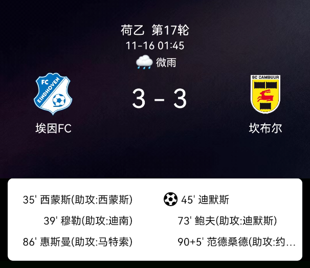 北京时间11月16日,荷兰乙级联赛第17轮,FC埃因霍温主场对阵坎布尔。第35分钟SvenSimons破门,1-0;第39分钟ThijsMuller破门,2-0;第45分钟迪默斯点射,2-1;第73分钟巴乌夫破门,2-2;第86分钟胡伊斯曼破门,3-2;第90+5分钟范德桑德破门,3-3;双方各2张黄牌,无红牌。最终比分,FC埃因霍温3-3坎布尔。
