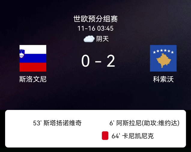 北京时间11月16日,世界杯欧洲区预选赛第一阶段小组赛第9轮,斯洛文尼亚对阵科索沃。第6分钟阿斯拉尼推射破门,1-0;第53分钟斯托扬诺维奇染红;第64分钟卡尔尼奇尼克自摆乌龙,2-0;斯洛文尼亚3张黄牌,科索沃无红黄牌。最终比分,斯洛文尼亚0-2科索沃。