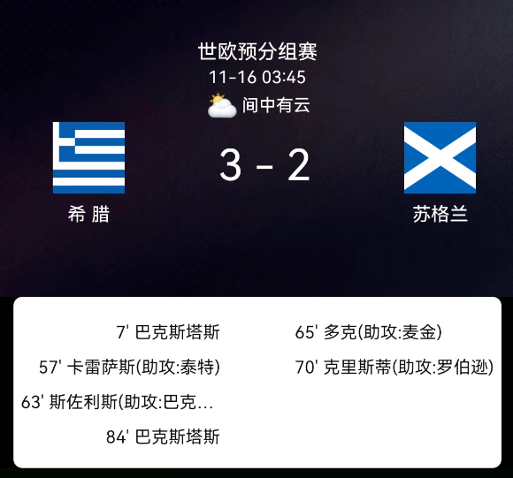北京时间11月16日,2026年世界杯欧洲区预选赛第一阶段小组赛第9轮,希腊对阵苏格兰。第7分钟巴卡西塔斯破门,1-0;第57分钟卡雷察斯破门,2-0;第63分钟措利斯破门,3-0;第65分钟本-多克破门,3-1;第70分钟克里斯蒂破门,3-2;第84分钟巴卡西塔斯染红;双方无额外黄牌。最终比分,希腊3-2苏格兰。