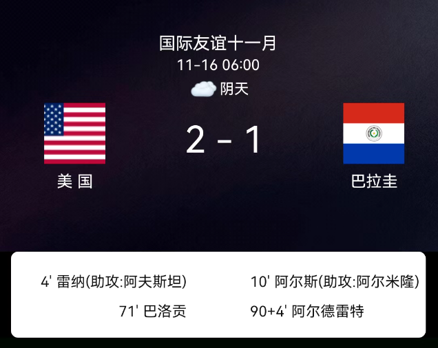 北京时间11月16日,国际友谊赛,美国对阵巴拉圭。第4分钟雷纳破门,1-0;第10分钟阿莱士-阿尔塞破门,1-1;第71分钟巴洛贡破门,2-1;全场无红黄牌记录。最终比分,美国2-1巴拉圭。