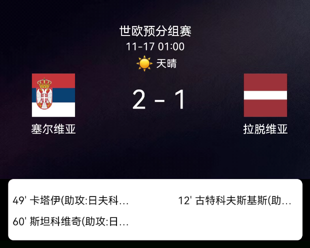 北京时间11月17日,2026年世界杯欧洲区预选赛第一阶段小组赛第10轮,塞尔维亚对阵拉脱维亚。第12分钟古特科夫斯基斯破门,0-1;第49分钟卡泰破门,1-1;第60分钟亚历山大-斯坦科维奇破门,2-1;全场无红黄牌。最终比分,塞尔维亚2-1拉脱维亚。