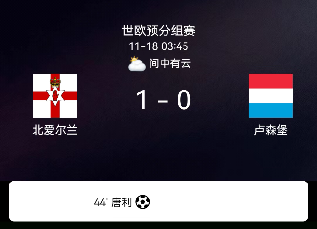 北京时间11月18日,世界杯欧洲区预选赛第一阶段小组赛第10轮,北爱尔兰对阵卢森堡。第44分钟杰米-唐利点射,1-0;北爱尔兰3张黄牌,卢森堡4张黄牌;无红牌。最终比分,北爱尔兰1-0卢森堡。