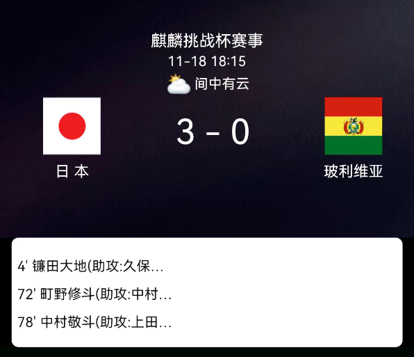北京时间11月18日,麒麟挑战杯赛事,日本对阵玻利维亚。第4分钟镰田大地破门,1-0;第25分钟菅原由势染黄;第34分钟纳瓦染黄;第55分钟板仓滉染黄;第71分钟町野修斗破门,2-0;第78分钟中村敬斗破门,3-0;无红牌。最终比分,日本3-0玻利维亚。