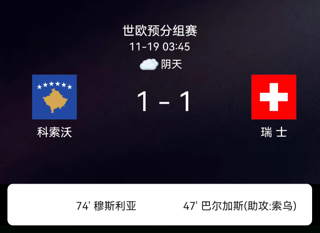 北京时间11月19日,2026年世界杯欧洲区预选赛第一阶段小组赛第10轮,科索沃对阵瑞士。第48分钟巴尔加斯破门,0-1;第70分钟米罗-穆海姆染黄;第76分钟西尔万-威德默染黄;第75分钟穆斯利亚破门,1-1;无红牌。最终比分,科索沃1-1瑞士。