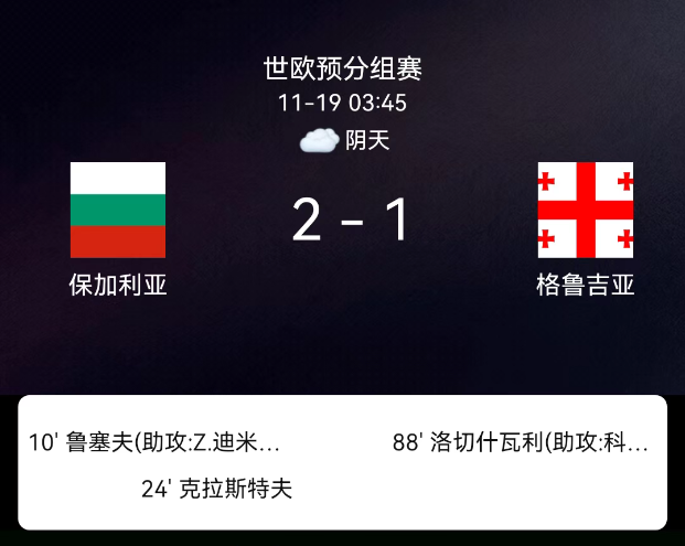 北京时间11月19日,2026年世界杯欧洲区预选赛第一阶段小组赛第10轮,保加利亚对阵格鲁吉亚。第10分钟鲁塞夫破门,1-0;第24分钟菲利普-克拉采夫破门,2-0;第65分钟保加利亚1张黄牌;第78分钟格鲁吉亚2张黄牌;第88分钟洛乔什维利破门,2-1;无红牌。最终比分,保加利亚2-1格鲁吉亚。