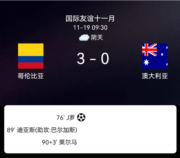 北京时间11月19日,国际友谊赛展开较量,哥伦比亚对阵澳大利亚。第76分钟哈梅斯-罗德里格斯点射破门,1-0;第89分钟路易斯-迪亚斯破门,2-0;下半场补时3分钟莱尔马破门,3-0;双方无红黄牌。最终比分,哥伦比亚3-0澳大利亚。
