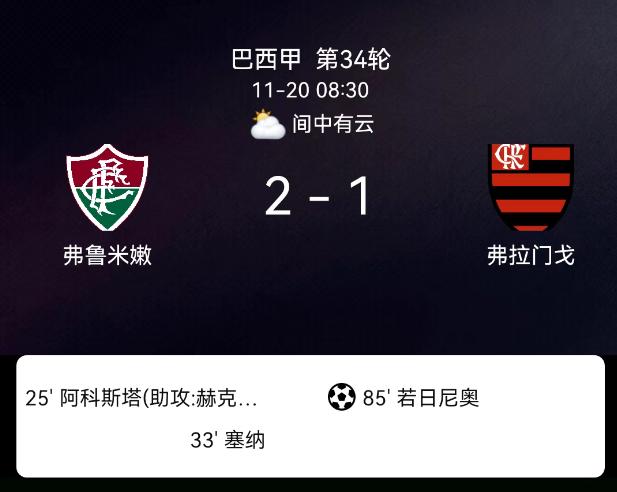 北京时间11月20日,巴西足球甲级联赛第34轮,弗鲁米嫩塞主场对阵弗拉门戈。第25分钟卢西亚诺-阿科斯塔破门,1-0;第33分钟凯文-塞尔纳破门,2-0;第85分钟若日尼奥点射扳回,2-1;弗鲁米嫩塞1张黄牌,弗拉门戈2张黄牌,无红牌。最终比分,弗鲁米嫩塞2-1弗拉门戈。