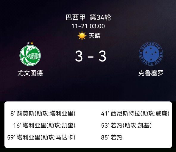 北京时间11月21日,巴西足球甲级联赛第34轮,尤文图德主场对阵克鲁塞罗。第8分钟马塞洛-埃梅斯破门,1-0;第16分钟加布里埃尔-塔利亚里破门,2-0;第41分钟西尼斯特拉破门,2-1;第53分钟凯奥-若热破门,2-2;第59分钟加布里埃尔-塔利亚里再破门,3-2;第85分钟凯奥-若热再破门,3-3;双方无红黄牌。最终比分,尤文图德3-3克鲁塞罗。