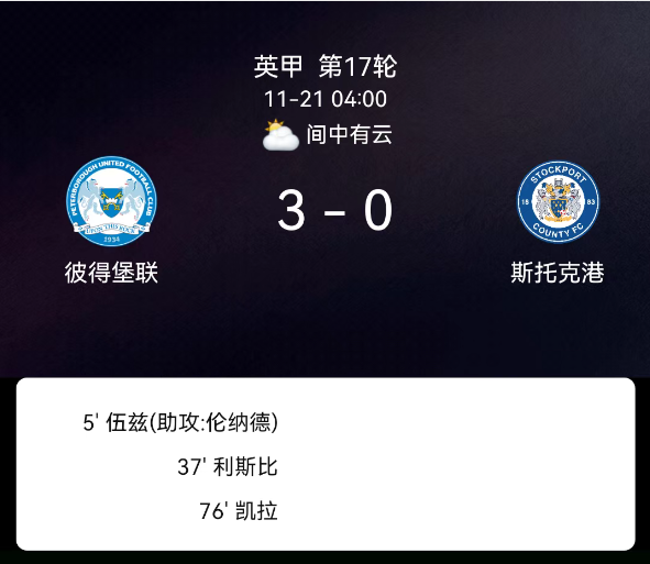 北京时间11月21日,英格兰足球甲级联赛第17轮,彼得堡联主场对阵斯托克波特郡。第5分钟本-伍兹破门,1-0;第37分钟凯雷尔-利斯比破门,2-0;第76分钟布兰登-凯拉破门,3-0;双方无红黄牌。最终比分,彼得堡联3-0斯托克波特郡。