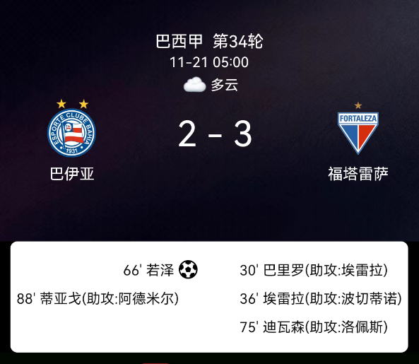 北京时间11月21日,巴西足球甲级联赛第34轮,巴伊亚主场对阵福塔莱萨。第30分钟巴雷罗破门,0-1;第36分钟何塞-埃雷拉破门,0-2;第66分钟威廉-若泽点射,1-2;第75分钟戴维尔森破门,1-3;第88分钟蒂亚戈破门,2-3;双方无红黄牌。最终比分,巴伊亚2-3福塔莱萨。