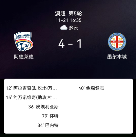 北京时间11月21日,澳大利亚足球超级联赛第5轮,阿德莱德联主场对阵墨尔本城。第12分钟阿拉吉奇破门,1-0;第15分钟卢卡-约万诺维奇破门,2-0;第36分钟皮埃里阿斯染红;第40分钟金森健志破门,2-1;第79分钟雷恩-怀特破门,3-1;第84分钟杰伊-巴尼特破门,4-1;双方无黄牌。最终比分,阿德莱德联4-1墨尔本城。