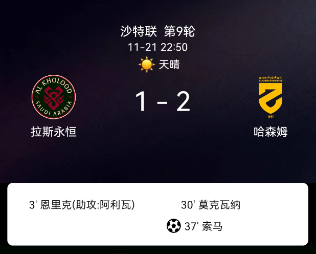 北京时间11月21日,沙特阿拉伯联第9轮,拉斯永恒主场对阵哈森姆。第3分钟拉米罗-恩里克破门,1-0;第30分钟莫克瓦纳破门,1-1;第37分钟奥马尔-索马点射,1-2;拉斯永恒1张黄牌,哈森姆3张黄牌,无红牌。最终比分,拉斯永恒1-2哈森姆。