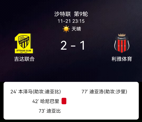 北京时间11月21日,沙特阿拉伯联第9轮,吉达联合主场对阵利雅得体育。第24分钟本泽马破门,1-0;第42分钟穆罕默德-海巴里自摆乌龙,2-0;第73分钟穆萨-迪亚比染红;第77分钟西拉破门,2-1;双方无黄牌。最终比分,吉达联合2-1利雅得体育。