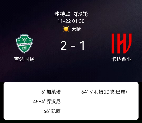 北京时间11月22日沙特阿拉伯联第9轮,吉达国民主场对阵胡拜尔库迪西亚,第6分钟加莱诺为吉达国民先下一城,第64分钟阿卜杜拉-萨利姆帮胡拜尔库迪西亚扳平,第66分钟凯西进球助吉达国民再次领先,最终比分吉达国民2-1胡拜尔库迪西亚。