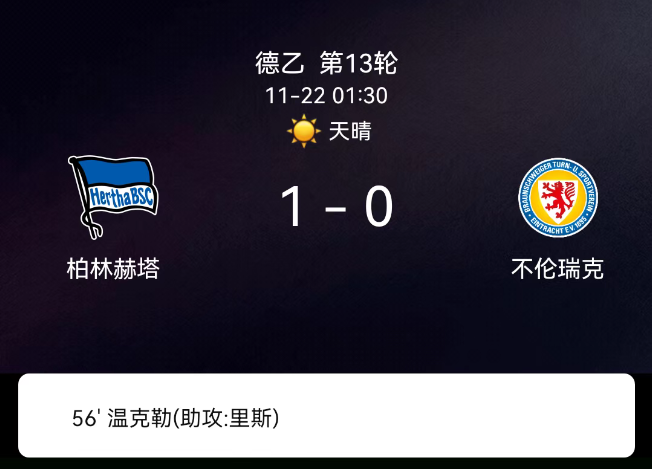 北京时间11月22日,德国足球乙级联赛第13轮,柏林赫塔主场迎战布伦瑞克,第56分钟里泽助攻温克勒破门,本场柏林赫塔获1张黄牌,布伦瑞克获3张黄牌,最终柏林赫塔1-0布伦瑞克。