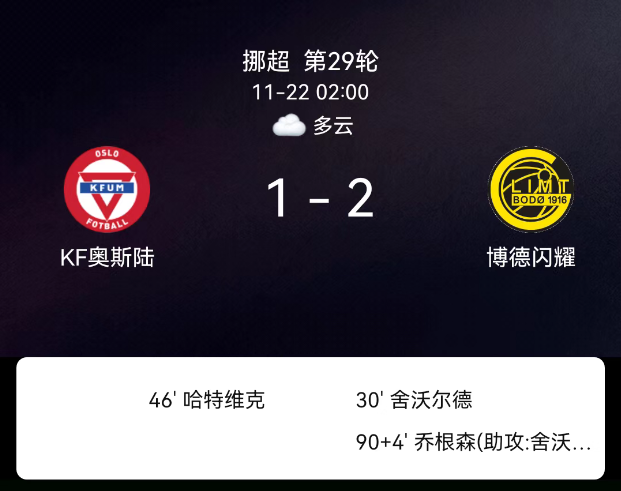 北京时间11月22日,挪威足球超级联赛第29轮,KFUM奥斯陆主场对阵博德闪耀。第30分钟舍沃尔德破门,0-1;第46分钟西奥多-伯格-哈尔特维克(TeodorBergHaltvik)破门,1-1;下半场补时4分钟约根森破门,1-2;双方无红黄牌。最终比分,KFUM奥斯陆1-2博德闪耀。