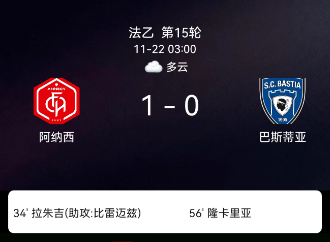 北京时间11月22日,法国足球乙级联赛第15轮,阿讷西主场对阵巴斯蒂亚。第34分钟科尼破门,1-0;第56分钟龙卡利亚染红;双方无黄牌。最终比分,阿讷西1-0巴斯蒂亚。