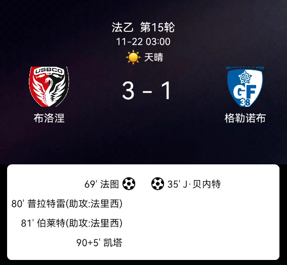 北京时间11月22日,法国足球乙级联赛第15轮,布洛涅主场对阵格勒诺布尔。第35分钟贝尼特点射,0-1;第69分钟科朗坦-法图(CorentinFatou)点射,1-1;第80分钟普拉特雷破门,2-1;第81分钟樊尚-比莱破门,3-1;补时5分钟苏莱曼-凯塔(SouleymaneKeita)两黄变一红;无其他黄牌。最终比分,布洛涅3-1格勒诺布尔。