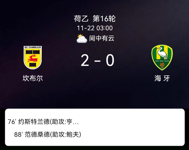 北京时间11月22日,荷兰乙级联赛第16轮,坎布尔主场对阵ADO海牙。第76分钟奥斯卡-舍斯特兰德(OscarSj?strand)破门,1-0;第88分钟范德桑德破门,2-0;双方无红黄牌。最终比分,坎布尔2-0ADO海牙。