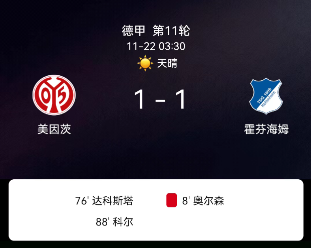 北京时间11月22日,德甲联赛第11轮,美因茨主场对阵霍芬海姆。第10分钟奥尔森自摆乌龙,0-1;第76分钟达科斯塔破门,1-1;第88分钟科尔染红;双方无其他黄牌。最终比分,美因茨1-1霍芬海姆。