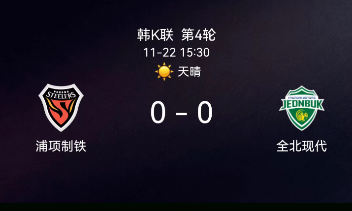北京时间11月22日,韩国经典K联赛争冠组第4轮,浦项铁人主场对阵全北现代。全场无进球,双方无红黄牌。最终比分,浦项铁人0-0全北现代。