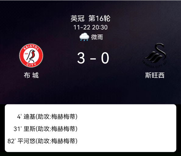 北京时间11月22日,英格兰足球冠军联赛第16轮,布里斯托尔城主场对阵斯旺西。第4分钟迪基破门,1-0;第31分钟里斯破门,2-0;第82分钟平河悠破门,3-0;双方无红黄牌。最终比分,布里斯托尔城3-0斯旺西。