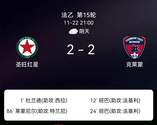 北京时间11月22日,法国足球乙级联赛第15轮,红星主场对阵克莱蒙。第1分钟迪朗破门,1-0;第12分钟班巴破门,1-1;第24分钟班巴再破门,1-2;第86分钟勒莫尼耶破门,2-2;双方无红黄牌。最终比分,红星2-2克莱蒙。
