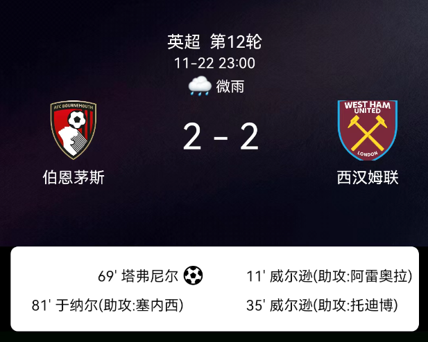 北京时间11月22日,英格兰足球超级联赛第12轮,伯恩茅斯主场对阵西汉姆联。第12分钟威尔逊破门,0-1;第35分钟威尔逊再破门,0-2;第67分钟塔韦尼耶点射,1-2;第81分钟于纳尔破门,2-2;双方无红黄牌。最终比分,伯恩茅斯2-2西汉姆联。