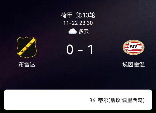 北京时间11月22日,荷兰甲级联赛第13轮,布雷达主场对阵PSV埃因霍温。第36分钟蒂尔破门,0-1;双方无红黄牌。最终比分,布雷达0-1PSV埃因霍温。
