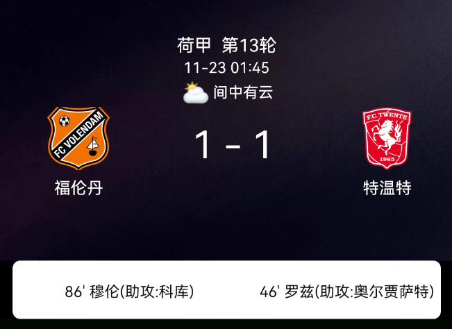 北京时间11月23日,荷兰甲级联赛第13轮,福伦丹主场迎战特温特。第46分钟,特温特球员桑德雷-奥尔贾萨特助攻罗茨破门,客队率先打破僵局;第86分钟,福伦丹球员柯克曲送出助攻,穆赫伦接球破门帮主队扳平比分,最终全场比分定格为福伦丹1-1特温特。