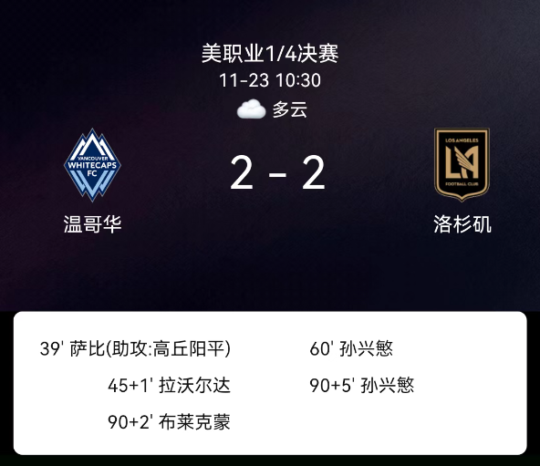 北京时间11月23日,美国职业大联盟1/4决赛,温哥华白浪主场对阵洛杉矶。第39分钟萨比破门,1-0;第45+1分钟拉沃尔达破门,2-0;第60分钟孙兴慜破门,1-2;第90+3分钟布莱克蒙两黄变一红;第90+6分钟孙兴慜任意球破门,2-2。最终比分,温哥华白浪2-2洛杉矶,双方进入加时。