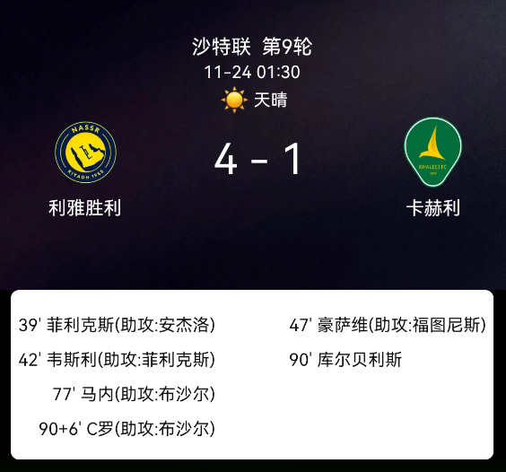 北京时间11月24日,沙特阿拉伯联第9轮,利雅得胜利主场对阵赛哈特海湾。第39分钟博尔热斯助攻菲利克斯推射破门;第43分钟菲利克斯助攻韦斯利-特谢拉兜射破门;第47分钟穆拉德-豪萨维弧顶抽射破门;第78分钟马内禁区迎球兜射破门;第90+2分钟库尔姆佩利斯蹬踏染红;第90+6分钟C罗凌空倒钩破门,最终比分利雅得胜利4-1赛哈特海湾。