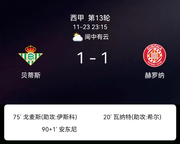 北京时间11月23日,西班牙足球甲级联赛第13轮,皇家贝蒂斯主场迎战赫罗纳。第20分钟瓦纳特破门,0-1;第75分钟巴伦廷-戈麦斯破门,1-1;第90+1分钟安东尼直红被罚下;双方无黄牌。最终比分,皇家贝蒂斯1-1赫罗纳。