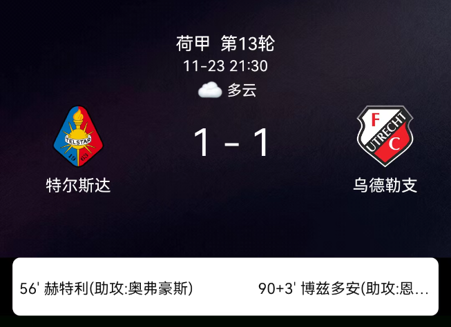 北京时间11月23日,荷兰甲级联赛第13轮,特尔斯达主场对阵乌德勒支。第56分钟赫特利破门,1-0;第72分钟乌德勒支球员染黄;下半场补时第3分钟博兹多安破门,1-1;特尔斯达获1张黄牌。最终比分,特尔斯达1-1乌德勒支。