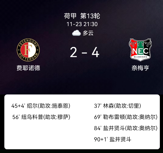 北京时间11月23日,荷兰足球甲级联赛第13轮,费耶诺德主场迎战奈梅亨。第37分钟林森破门,0-1;上半场补时第4分钟莱奥-绍尔破门,1-1;第56分钟纽科普破门,2-1;第69分钟勒布雷顿破门,2-2;第84分钟盐贝健人破门,2-3;下半场补时第1分钟盐贝健人破门,2-4;双方均无红黄牌。最终比分,费耶诺德2-4奈梅亨。