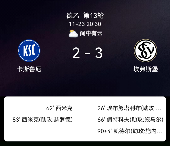 北京时间11月23日,德国足球乙级联赛第13轮,卡尔斯鲁厄主场迎战埃弗斯堡。第26分钟埃布努塔利布破门,0-1;第41分钟卡尔斯鲁厄球员染黄;第62分钟罗科-西米奇破门,1-1;第66分钟佩特科夫破门,1-2;第83分钟罗科-西米奇破门,2-2;下半场补时第4分钟FelixKeidel破门,2-3;埃弗斯堡获1张黄牌。最终比分,卡尔斯鲁厄2-3埃弗斯堡。
