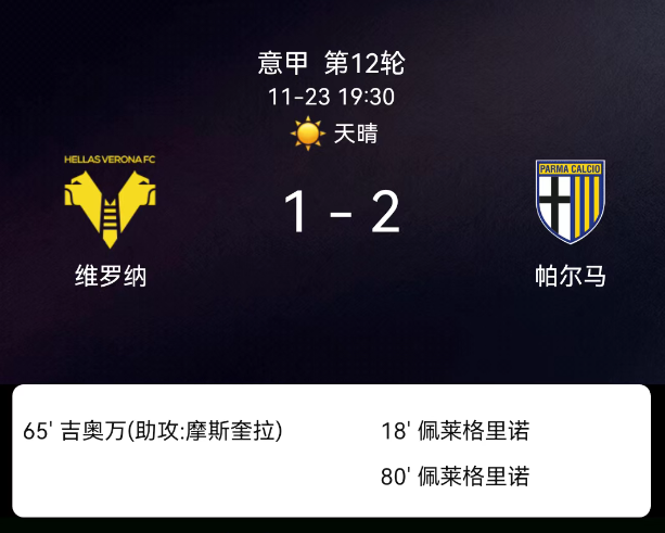 北京时间11月23日,意大利足球甲级联赛第12轮,维罗纳主场迎战帕尔马。第18分钟马特奥-佩莱格里诺破门,0-1;第42分钟维罗纳球员染黄;第65分钟焦瓦内破门,1-1;第73分钟帕尔马球员染黄;第80分钟马特奥-佩莱格里诺破门,1-2;维罗纳获3张黄牌,帕尔马获2张黄牌。最终比分,维罗纳1-2帕尔马。