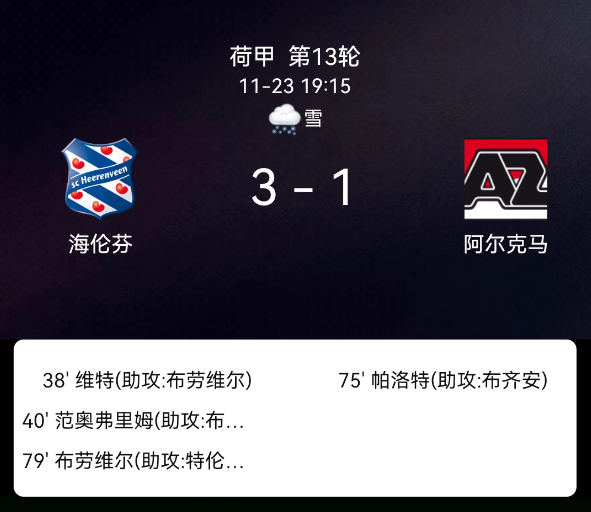 北京时间11月23日,荷兰甲级联赛第13轮,海伦芬主场迎战阿尔克马尔。第38分钟芬特破门,1-0;第40分钟范奥弗里姆破门,2-0;第75分钟帕罗特破门,2-1;第79分钟布鲁韦尔斯破门,3-1;双方均无红黄牌。最终比分,海伦芬3-1阿尔克马尔。