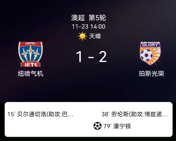 北京时间11月23日,澳大利亚足球超级联赛第5轮,纽卡斯尔喷气机主场迎战珀斯光荣。第15分钟XavierBertoncello破门,1-0;第38分钟汤姆-劳伦斯破门,1-1;第79分钟彭宁顿罚入点球,1-2;纽卡斯尔喷气机1张黄牌,珀斯光荣5张黄牌。最终比分,纽卡斯尔喷气机1-2珀斯光荣。