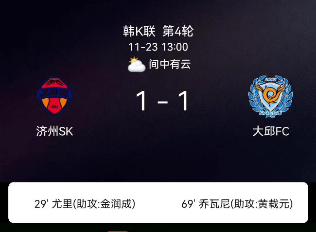 北京时间11月23日,韩国经典K联赛保级组第4轮,济州SK主场迎战大邱FC。第29分钟尤里破门,1-0;第50分钟大邱FC球员染黄;第69分钟热奥瓦尼破门,1-1;第78分钟济州SK球员染黄。最终比分,济州SK1-1大邱FC。