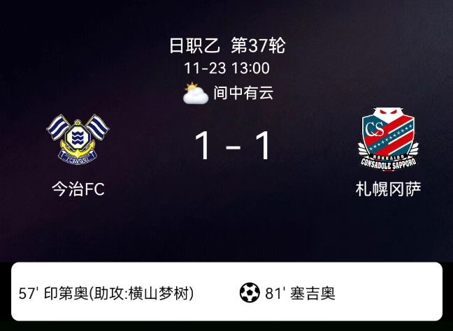 北京时间11月23日,日本职业足球联赛J2联赛第37轮,FC今治主场迎战北海道札幌冈萨多。第57分钟马库斯-维尼修斯破门,1-0;第65分钟FC今治球员染黄;第81分钟马里奥-塞尔吉奥罚入点球,1-1;北海道札幌冈萨多获1张黄牌。最终比分,FC今治1-1北海道札幌冈萨多。