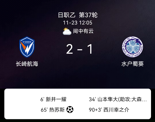 北京时间11月23日,日本职业联赛J2联赛第37轮,长崎航海主场对阵水户蜀葵。第6分钟新井一耀破门,1-0;第34分钟山本隼大破门,1-1;第64分钟马特乌斯-热苏斯罚入点球,2-1;下半场补时第3分钟西川幸之介染红。最终比分,长崎航海2-1水户蜀葵。