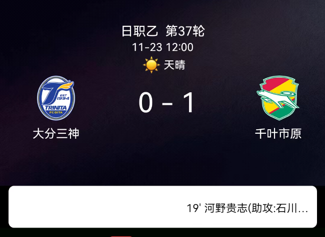 北京时间11月23日,日本职业联赛J2联赛第37轮,大分三神主场对阵千叶市原。第20分钟河野贵志破门,0-1;大分三神2张黄牌,千叶市原3张黄牌。最终比分,大分三神0-1千叶市原。