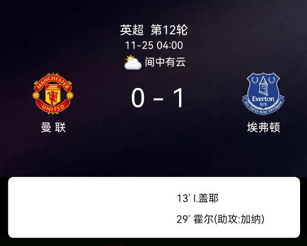 北京时间11月25日,英格兰足球超级联赛第12轮,曼联主场对阵埃弗顿。第16分钟盖伊染红,埃弗顿十人应战;第29分钟霍尔破门,0-1;双方均无黄牌。最终比分,曼联0-1埃弗顿。