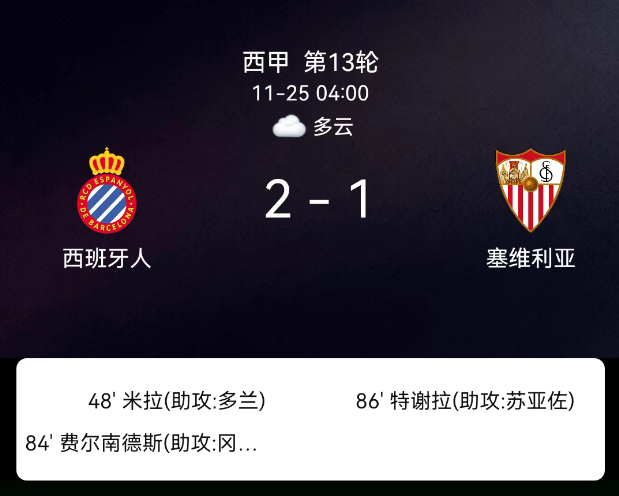 北京时间11月25日,西班牙足球甲级联赛第13轮,西班牙人主场迎战塞维利亚。第48分钟佩雷-米利亚破门,1-0;第84分钟罗伯托-费尔南德斯破门,2-0;第86分钟马尔康-特谢拉破门,2-1;双方各1张黄牌。最终比分,西班牙人2-1塞维利亚。
