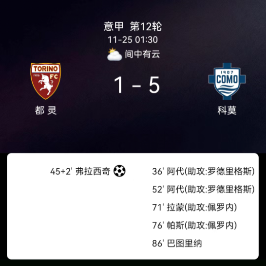 北京时间11月25日,意大利足球甲级联赛第12轮,都灵主场迎战科莫。第36分钟阿达伊破门,0-1;上半场补时第2分钟弗拉希奇罚入点球,1-1;第52分钟阿达伊再破门,1-2;第71分钟哈科沃-拉蒙破门,1-3;第76分钟尼科-帕斯破门,1-4;第86分钟巴图里纳破门,1-5;双方均无红黄牌。最终比分,都灵1-5科莫。