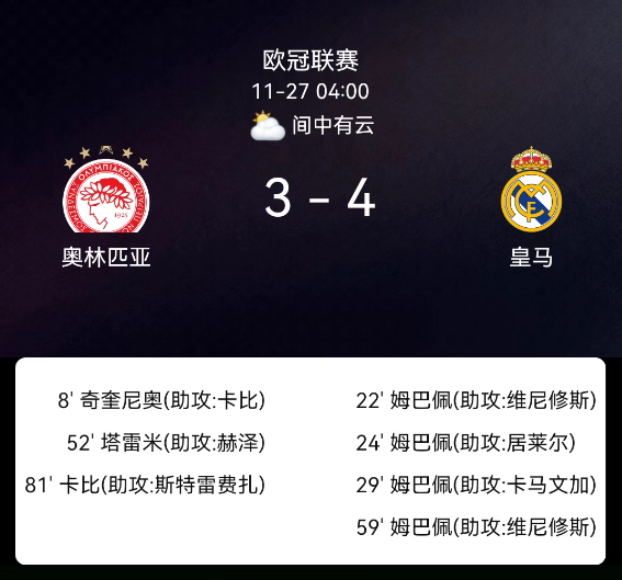 北京时间11月27日4:00,欧洲冠军联赛联赛阶段第5轮,奥林匹亚科斯主场对阵皇家马德里。第8分钟奇基尼奥破门,1-0;第22分钟姆巴佩破门,1-1;第24分钟姆巴佩再破门,1-2;第29分钟姆巴佩破门,1-3;第52分钟塔雷米破门,2-3;第59分钟姆巴佩破门,2-4;第81分钟卡埃比破门,3-4;皇马2张黄牌,奥林匹亚科斯1张黄牌。最终比分,奥林匹亚科斯3-4皇家马德里。