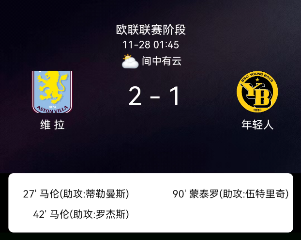 北京时间11月23日,英格兰足球超级联赛第12轮,利兹联主场对阵阿斯顿维拉。第8分钟卢卡斯-恩梅加破门,1-0;第48分钟摩根-罗杰斯破门,1-1;第75分钟摩根-罗杰斯再破门,1-2;双方均无红黄牌。最终比分,利兹联1-2阿斯顿维拉。